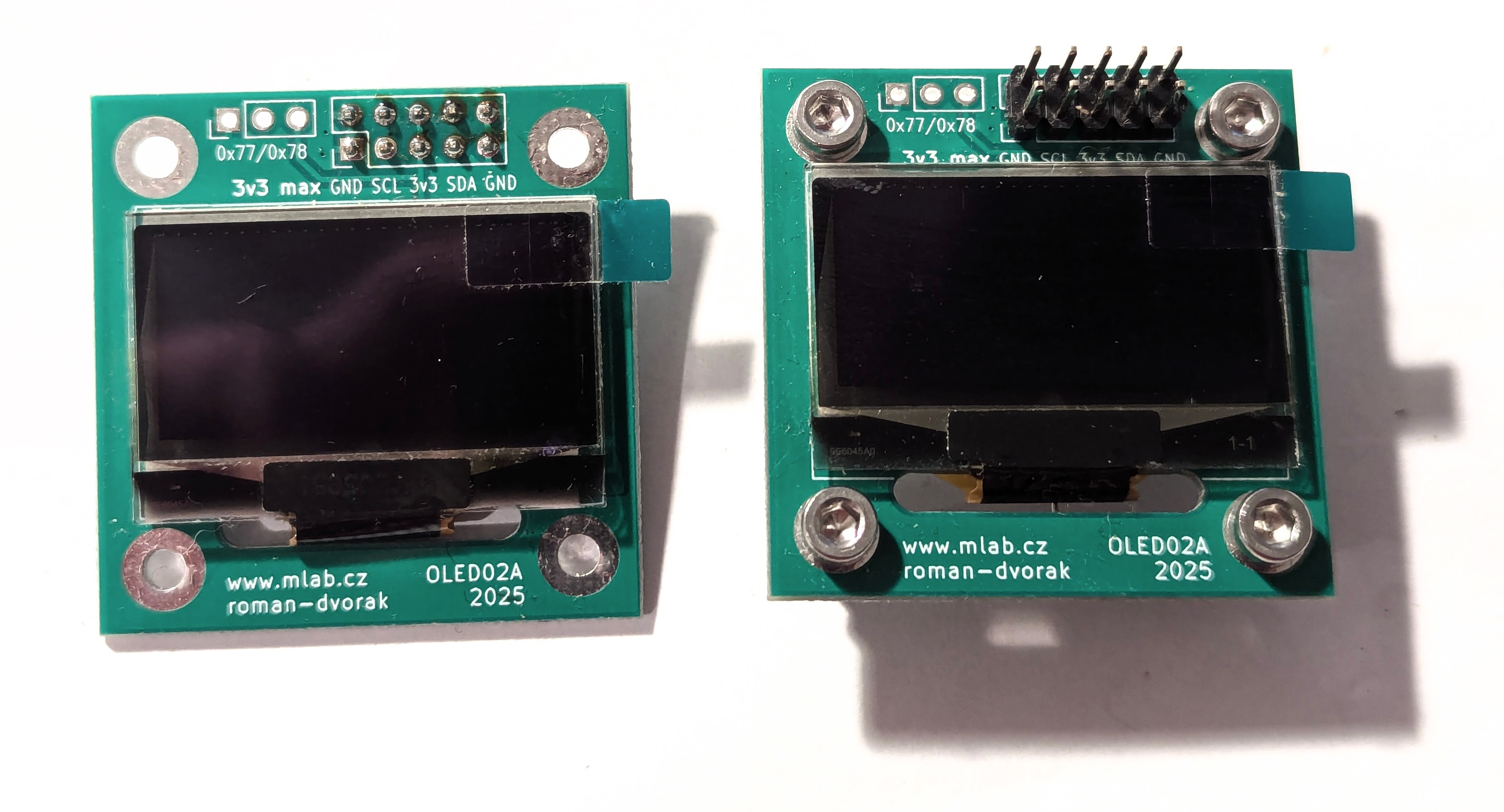The OLED02A is a simplified variant of the MLAB OLED01 module. It features a 1.3-inch blue OLED display using the SSD1306BZ controller and communicates over an I²C interface.